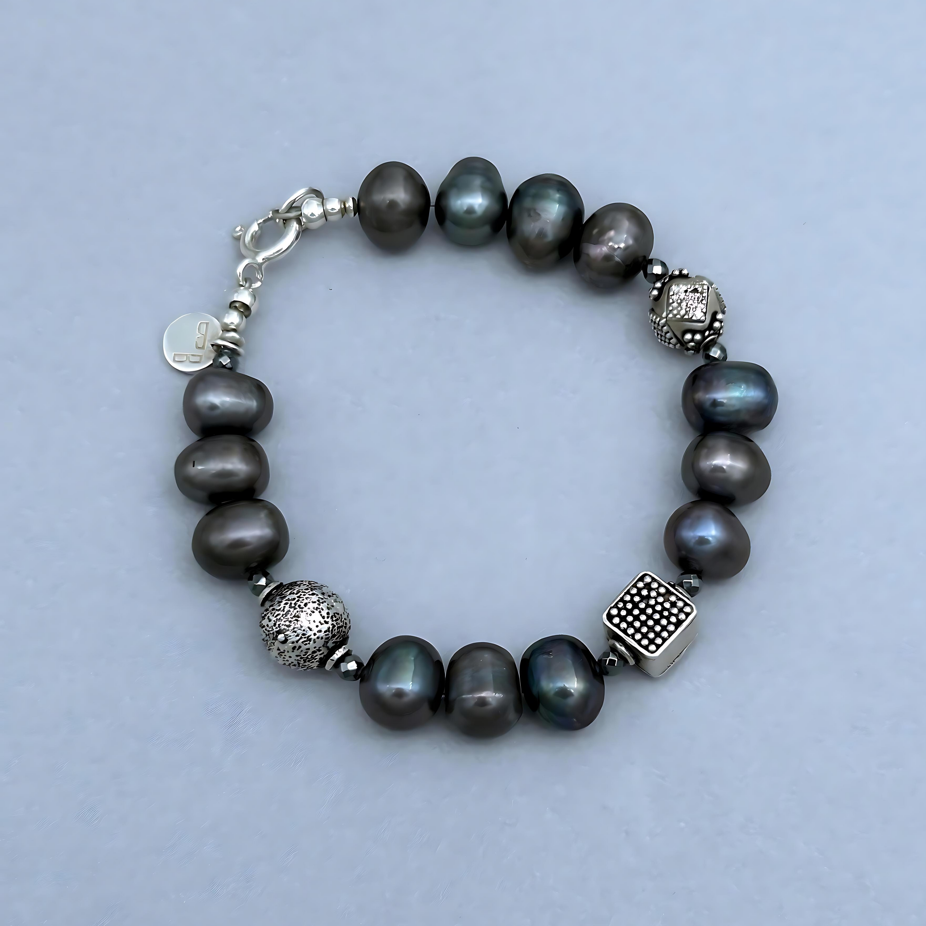 En regardant ce bracelet BijouBijou, vous admirez la couleur de la mer sous un clair de lune. NAIDA a été monté avec des Perles Cultivées d’Eau Douce Grises et de l’Hématite à facettes. Trois perles en argent sterling ajoutent un air tendance et cool